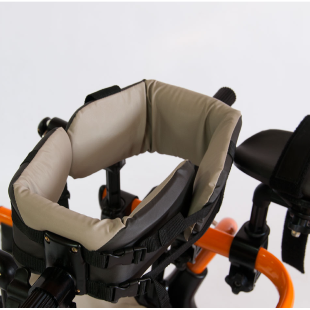 - Мягкий фиксатор грудной клетки (модели 1000, 1002): поддерживает туловище в требуемом положении. Высота фиксатора, угол его крепления и объем (под различные размеры туловища) регулируются. Все регулировки осуществляются, когда пациент находится в опорах-ходунках, что обеспечивает максимальную точность подгонки.