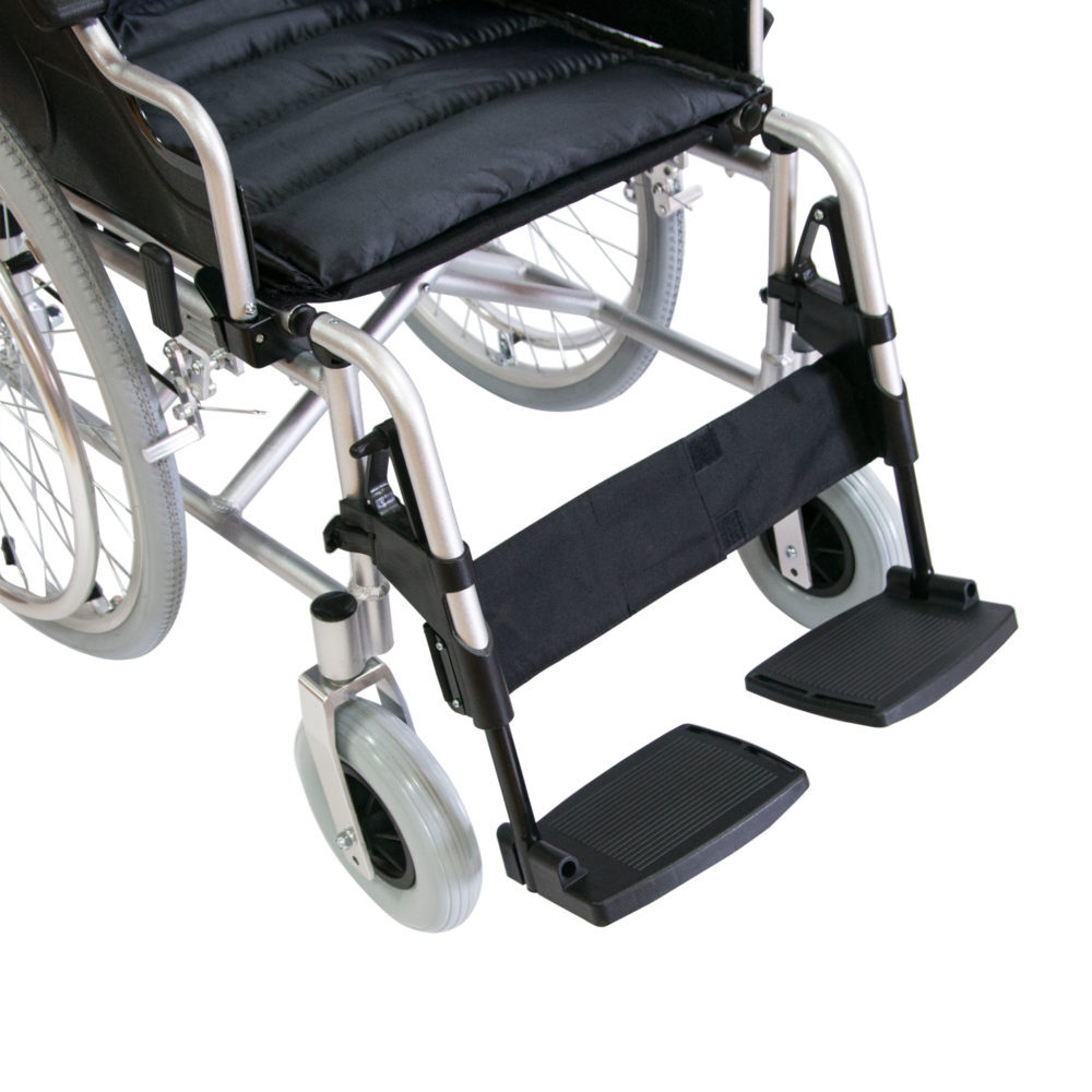 - Опоры для ног: для установки опор на кресло-коляску необходимо надеть опору на направляющие, находящиеся на раме и повернуть в сторону от колеса до срабатывания фиксатора. Модели комплектуются подножками, которые при необходимости отводятся в стороны или откидываются, а так же откидные подлокотники.