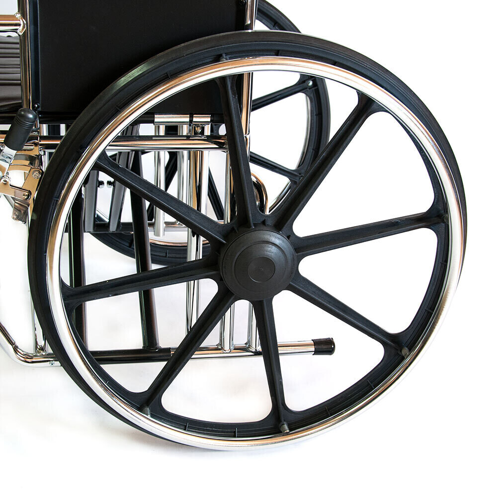 - Особая конструкция рамы кресла-коляски: выполнена из высокопрочной стали с хромовым покрытием, которое защищает от коррозии и облегчает санитарную обработку. Ее складная часть состоит из двойной крестовины, которая позволяет равномерно распределить нагрузку на несущие элементы конструкции.