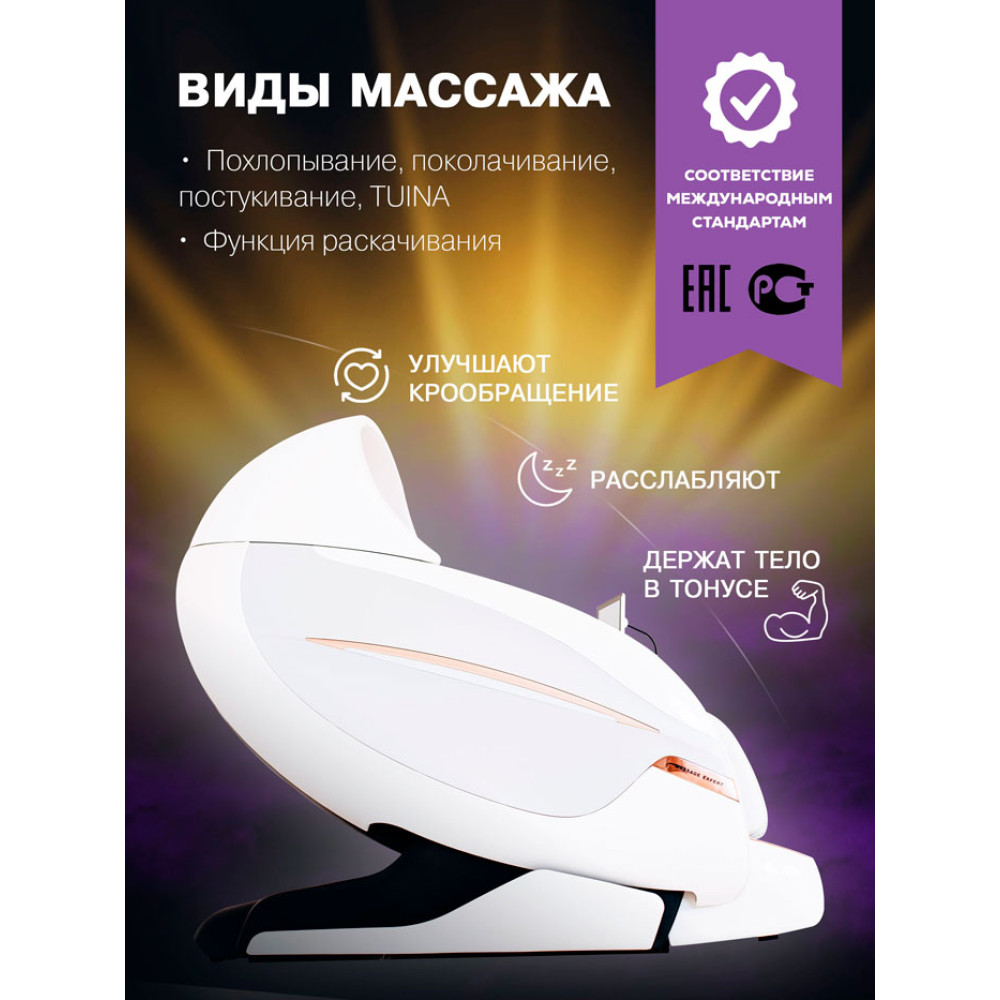 Кресло массажное Takasima Venerdi MASSAGE EXPERT MS-131 Plus - предлагает массаж различных областей тела: шеи, плеч, спины, талии, рук, ягодиц, бедер, коленей, икр и стоп. Кресло имеет капюшон, что обеспечивает уединение во время массажа. Оно также имеет 3D массаж, функцию "Zero Gravity" для чувства невесомости, двадцать четыре автоматические программы массажа и функцию раскачивания для дополнительного расслабления.