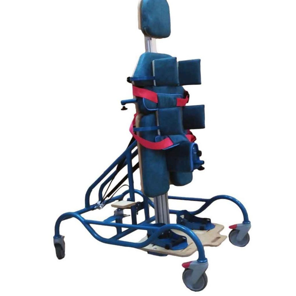Базовый комплект включает: многофункциональный вертикализатор с металлической рамой и с поворотным ложем со съемными модулями, подножкой со стоподержателями, абдуктором, системой креплений, боковыми упорами и универсальным съемным столиком.Пневматический привод.