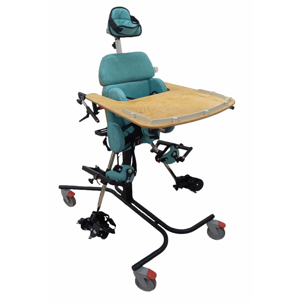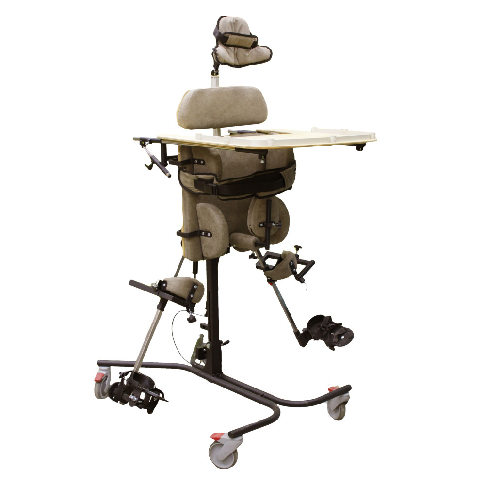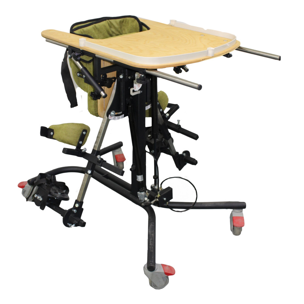 Опора функциональная для стояния для детей-инвалидов Я Могу! ОС-220.5 - это опора для стояния (вертикализатор) с комбинированным наклоном и функцией абдукции на четырехколесном основании с поворотными колесами со стояночными тормозами, опора оснащена боковыми ограничителями, абдуктором, с устройством для разведения ног, с раздельными многопозиционными подножками со стоподержателями и многопозиционными коленоупорами, столиком, системой креплений в виде ремней и пневмоприводом.