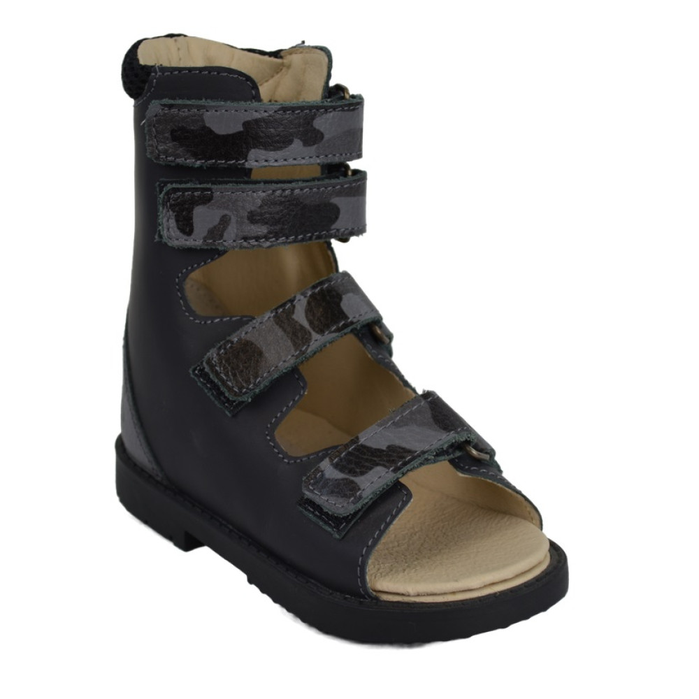 Высокие детские сандалии из натуральной кожи. Благодаря полной хирургической раскрываемости эту модель можно быстро и легко обуть на любую ножку. Специальный жёсткий задник помогает скорректировать положение стопы, удобная система застёжек велькро надёжно фиксирует его, а так же даёт возможность самообувания. Мягкий кант делает носку изделия комфортнее. Особая конструкция подошвы равномерно поддерживает свод, предотвращая заваливание стопы вовнутрь, и распределяет ударную нагрузку при ходьбе.