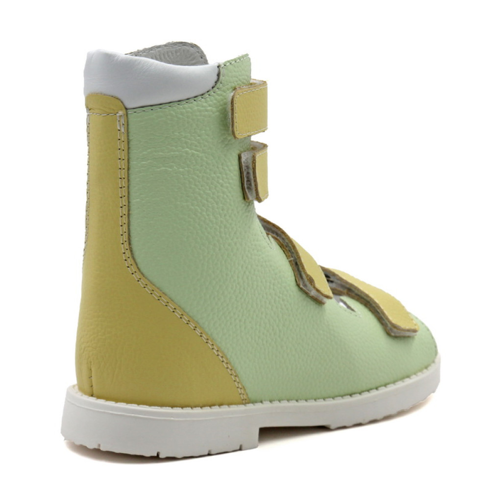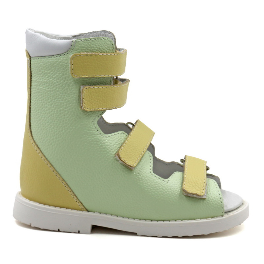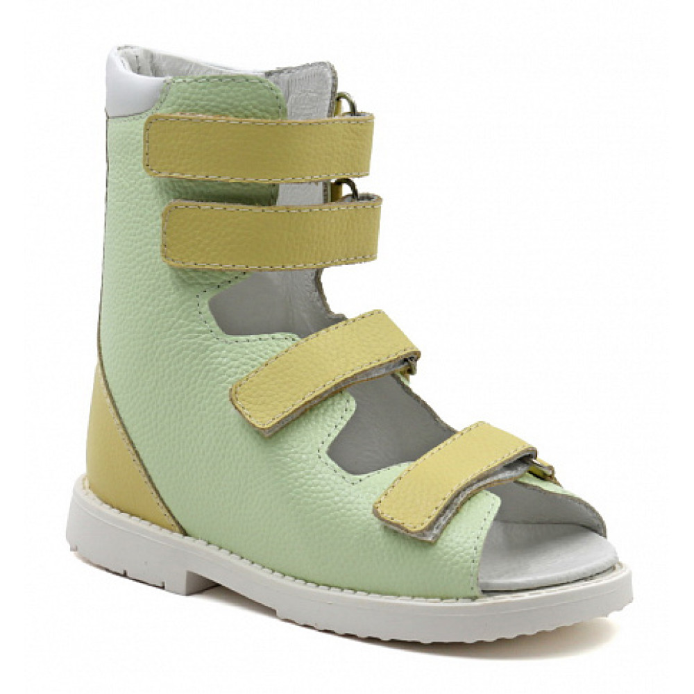 Ортопедическая обувь сложная без утепленной подкладки. Dысокие детские сандалии из натуральной кожи. Благодаря полной хирургической раскрываемости эту модель можно быстро и легко обуть на любую ножку. Специальный жёсткий задник помогает скорректировать положение стопы, удобная система застёжек велькро надёжно фиксирует его, а так же даёт возможность самообувания. Мягкий кант делает носку изделия комфортнее. Особая конструкция подошвы равномерно поддерживает свод, предотвращая заваливание стопы вовнутрь, и распределяет ударную нагрузку при ходьбе. Подошва выполнена из упругого и износостойкого материала.