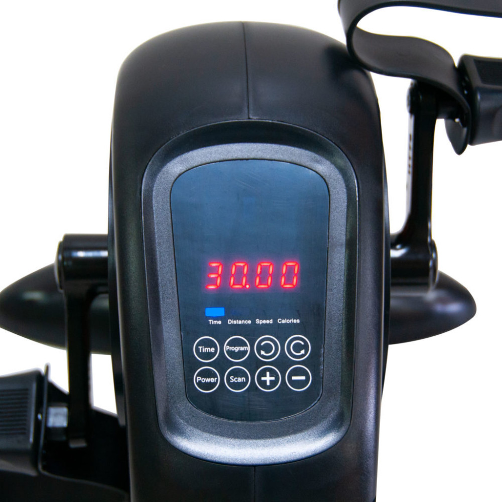 С помощью пульт управления или кнопок на дисплее можно настроить режимы тренировки. Можно регулировать скорость вращения педалей, направление вращение (вперед/назад). Дисплей тренажера отображает время, пройденную дистанцию и счетчик калорий.